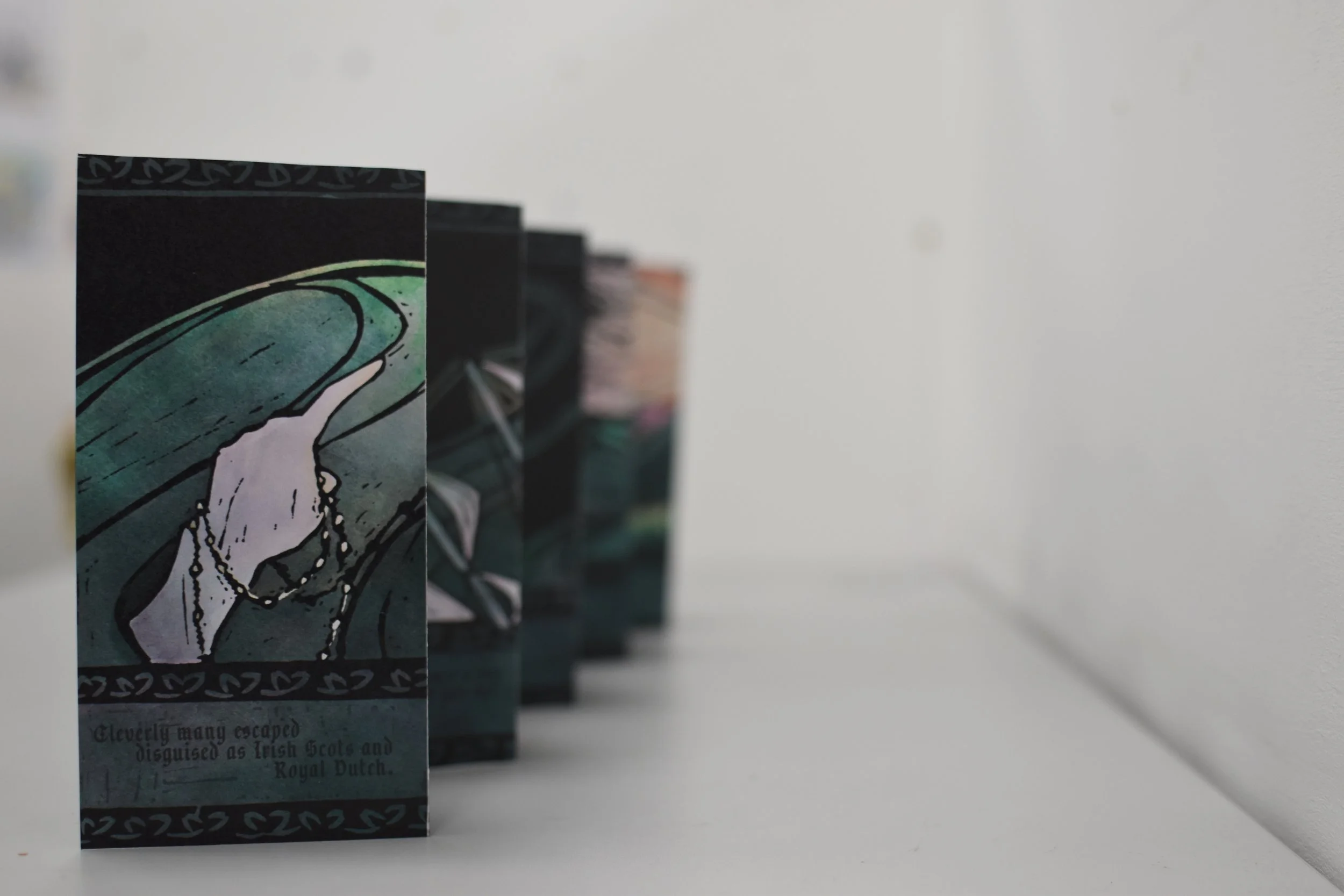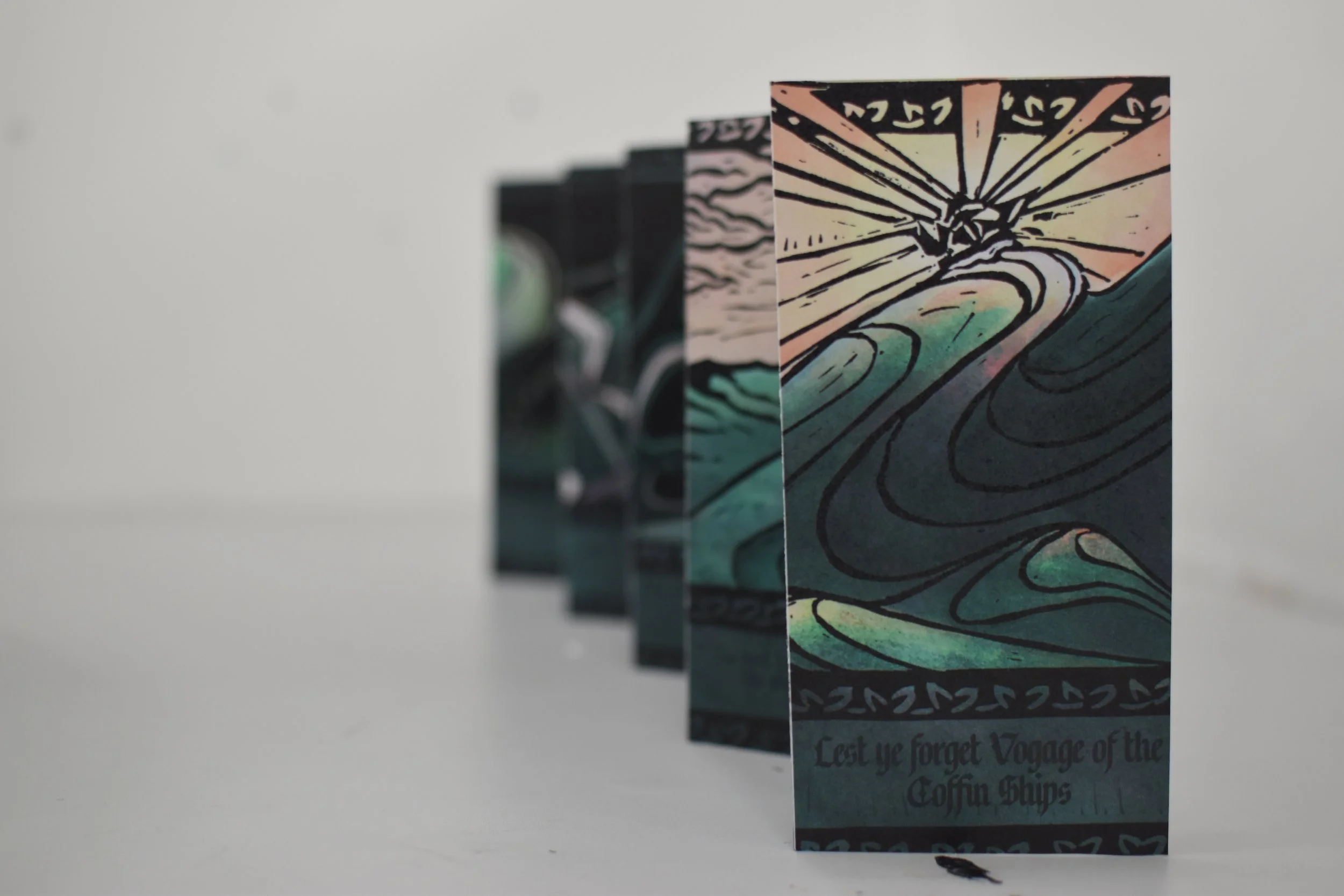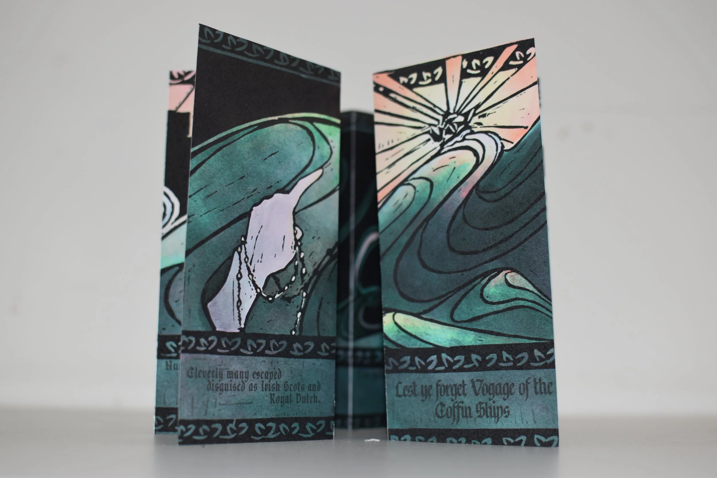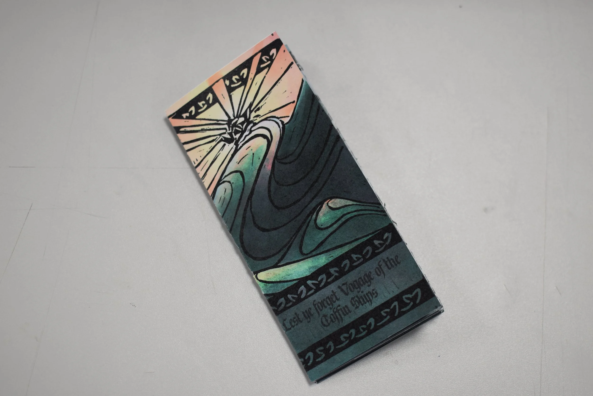 BA Illustration, third year final major project lino printed concertina. A story following the voyage of the coffin ships that sailed during the Great Irish Famine, depicting Frank Gilligan’s poem “The Coffin Ships - Children of the Gael”.